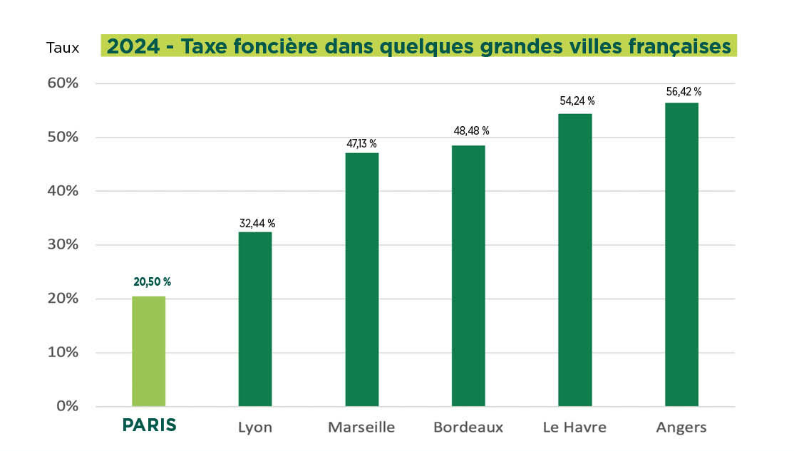La taxe foncière atteint à Paris 20,5% à Paris, un taux bien en-deçà des 41,6% en moyenne pour les grandes villes.